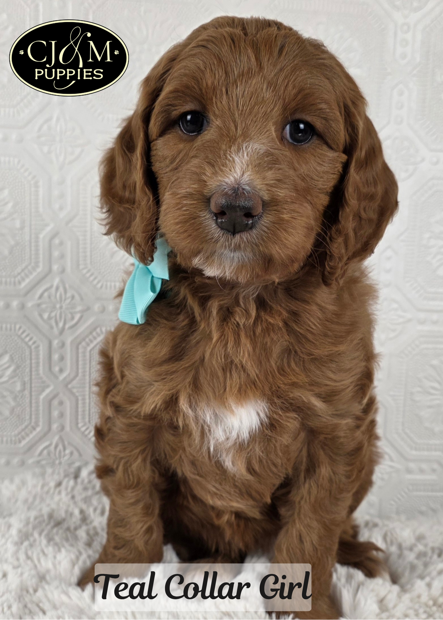 Copper’s puppies will have golden, apricot, party and red coats with some having white markings like dad. They will all have curly coats Puppies will mature to weigh between 20-45 pounds averaging 30-35 pounds.